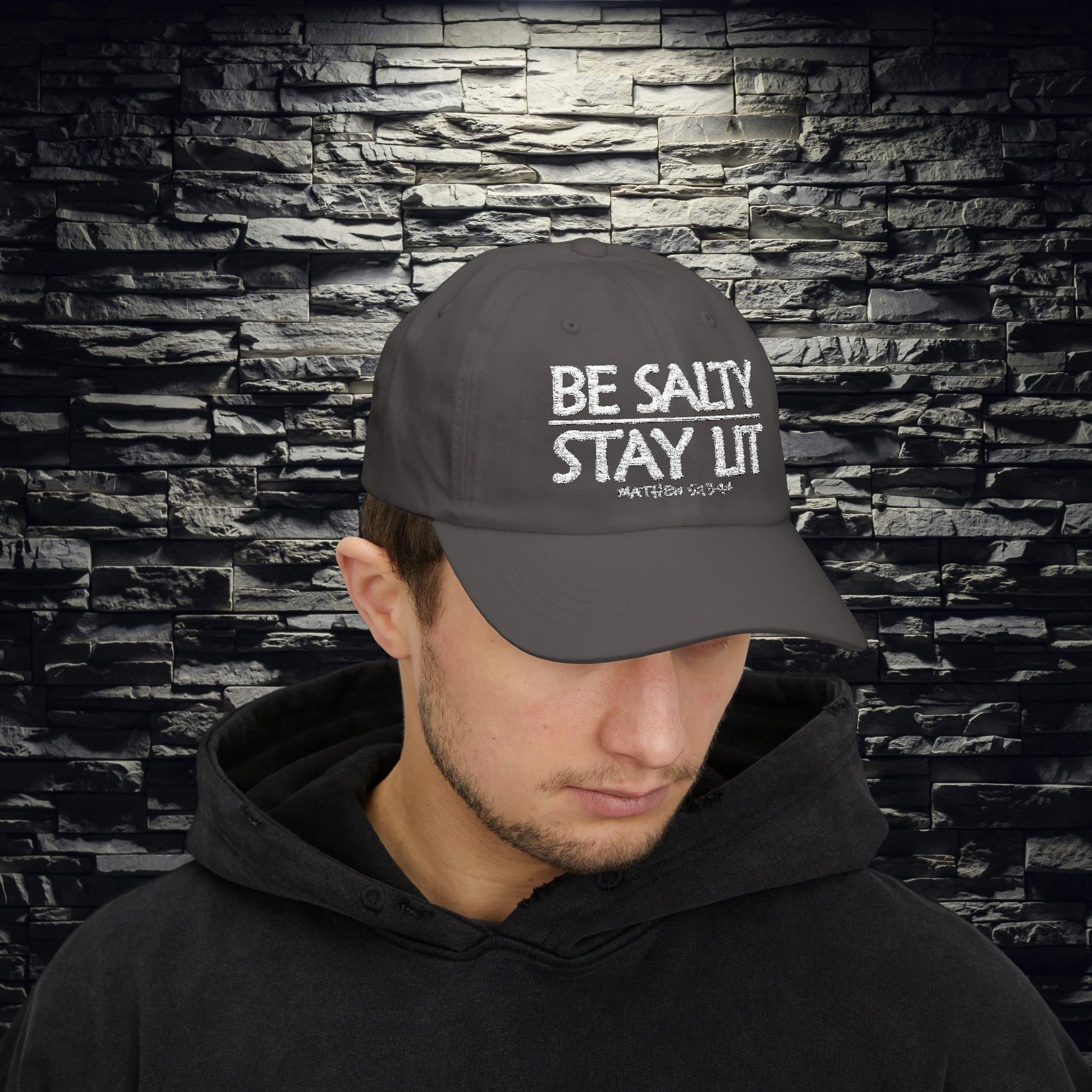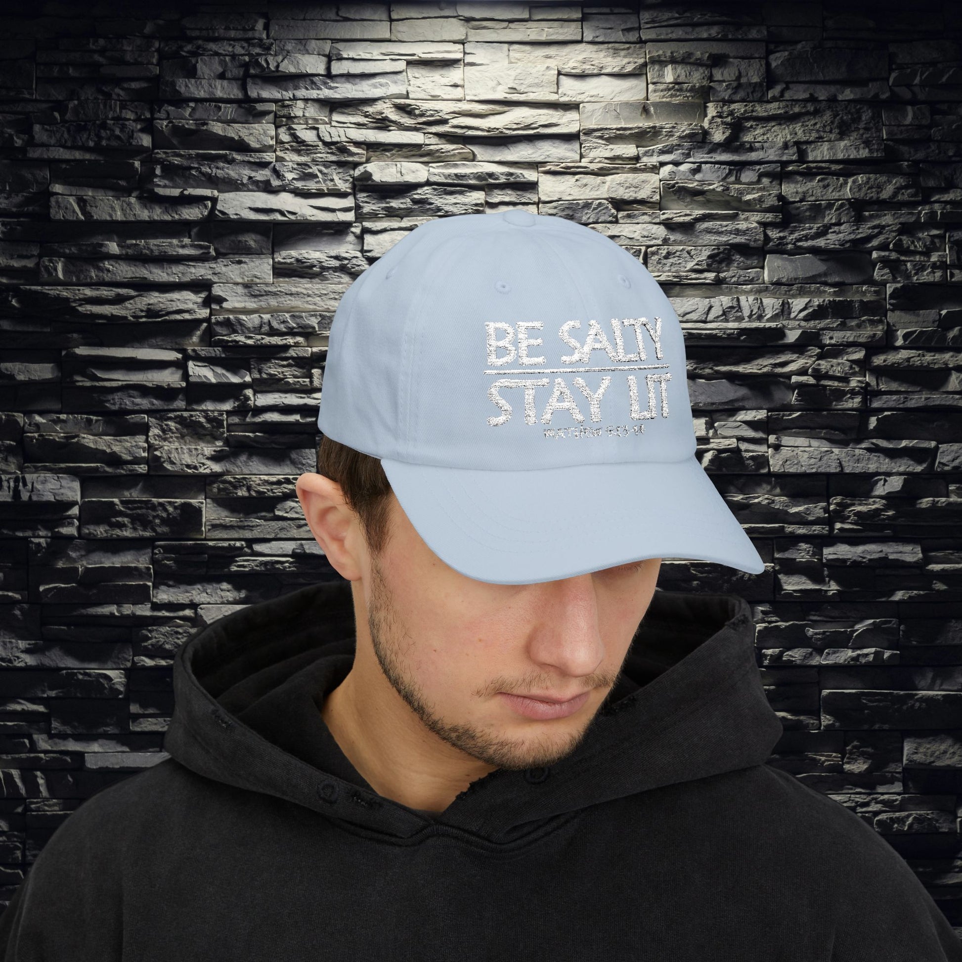 Stay cool while shining bright with our Be Salty Stay Lit Dad Hat — inspired by Matthew 5:13–16, where Jesus calls us to be the salt of the earth and the light of the world. This relaxed-fit hat brings biblical truth to modern streetwear, perfect for believers who want to represent their faith with subtle confidence.