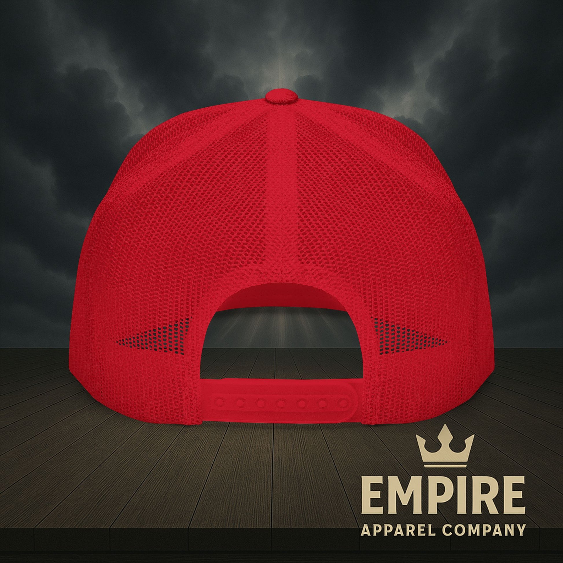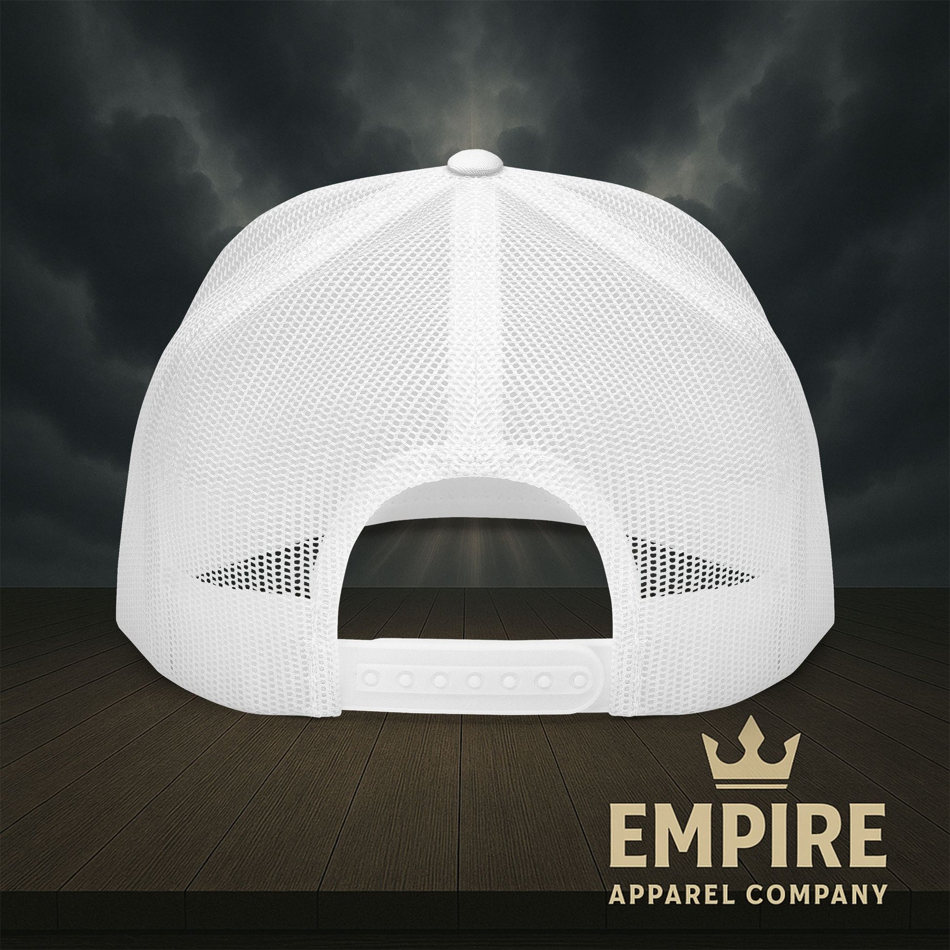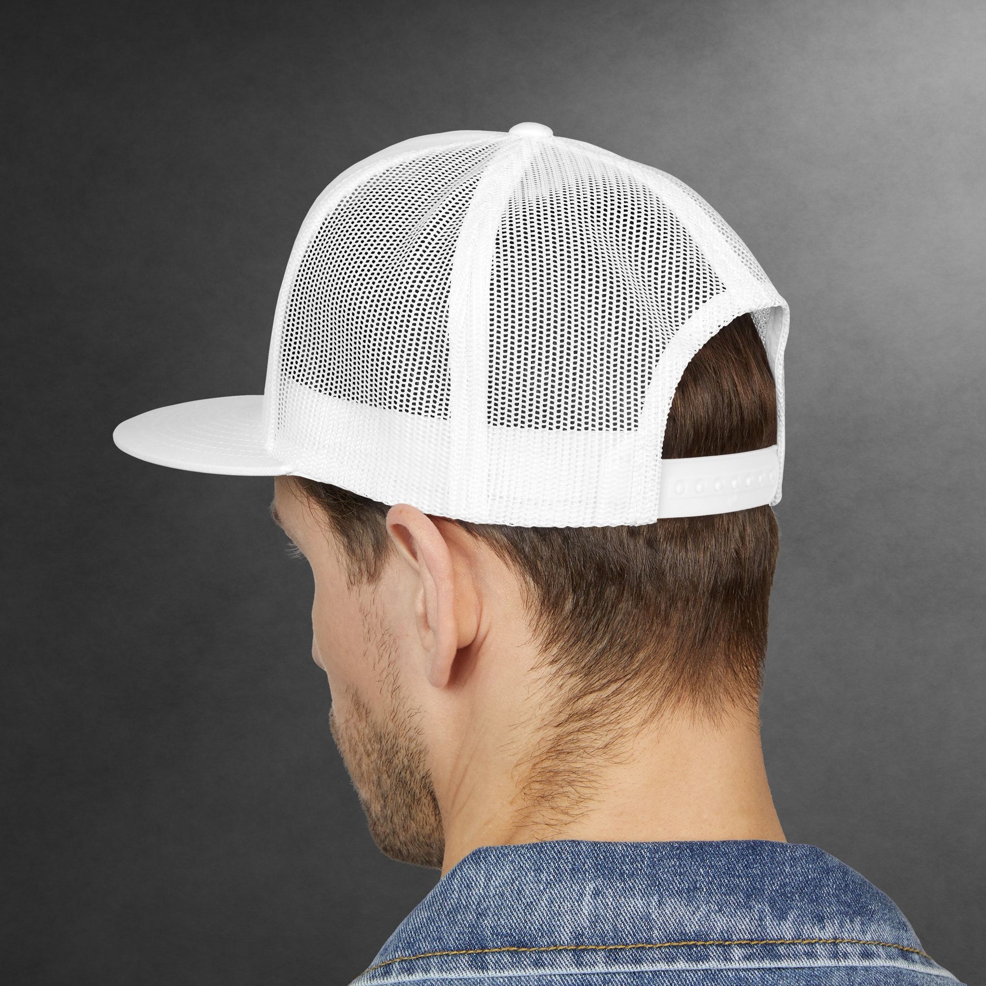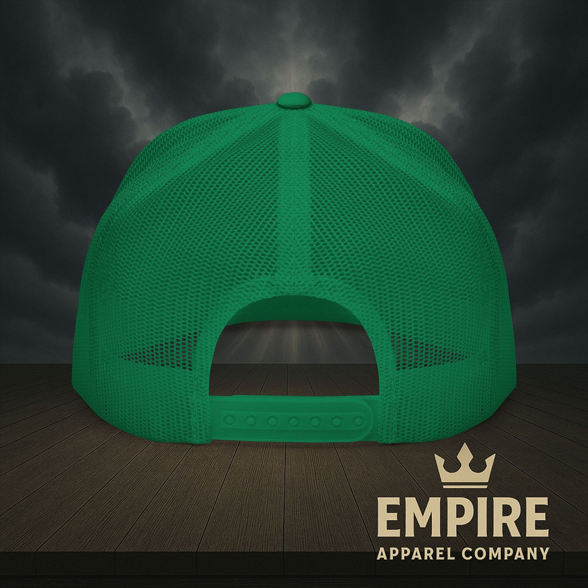 🧢 Classic trucker style – Structured 5-panel build with high-profile crown and flat bill.